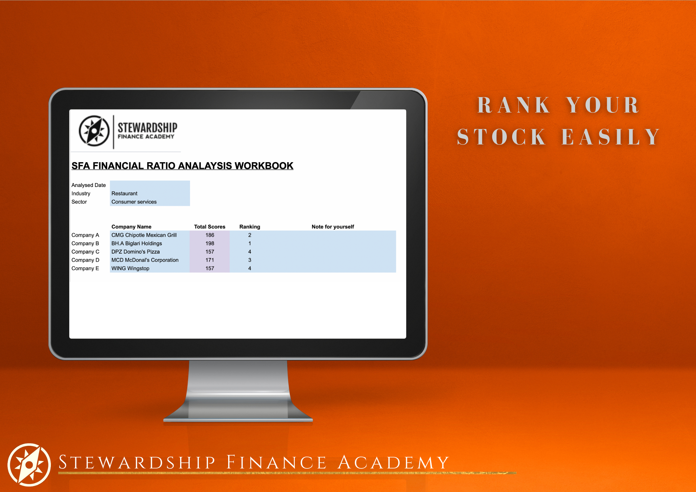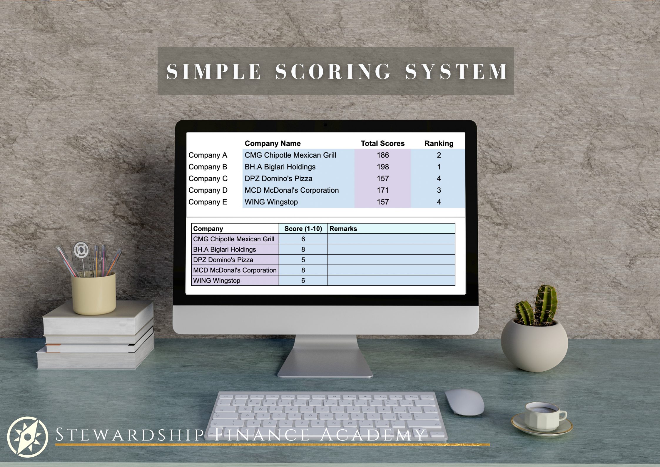 This workbook includes a simple scoring system for comparing up to five different company stocks in order to choose the best stock to invest in.
